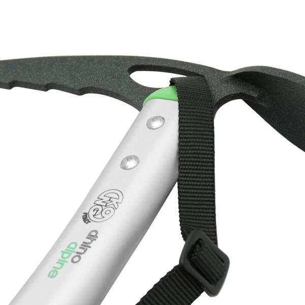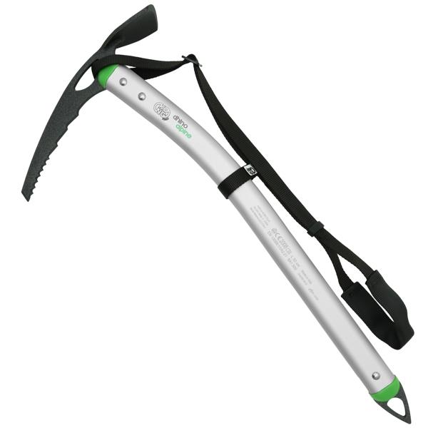 Technical mountaineering ice axe. Light alu alloy bent body, zinc plated steel peak and spike.Dragonne made with sling to make it unmissable.Available in three sizes (50, 55 and 60 cm).Certified CE EN 13089/1.