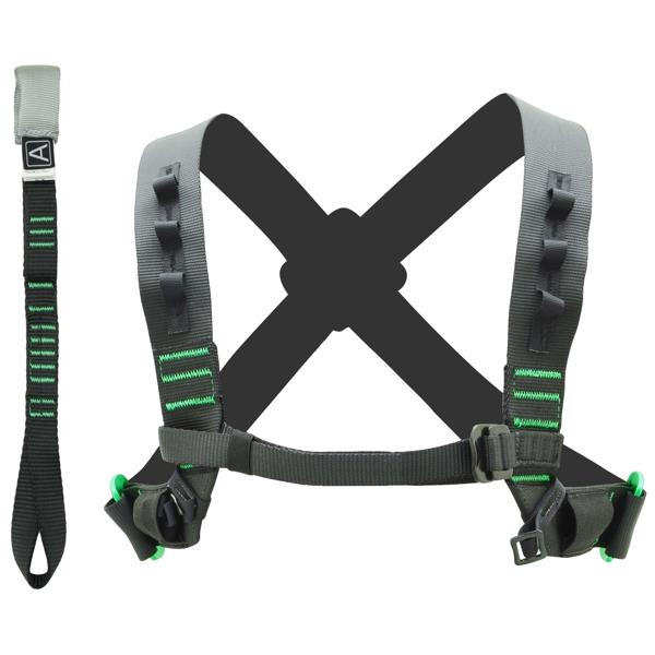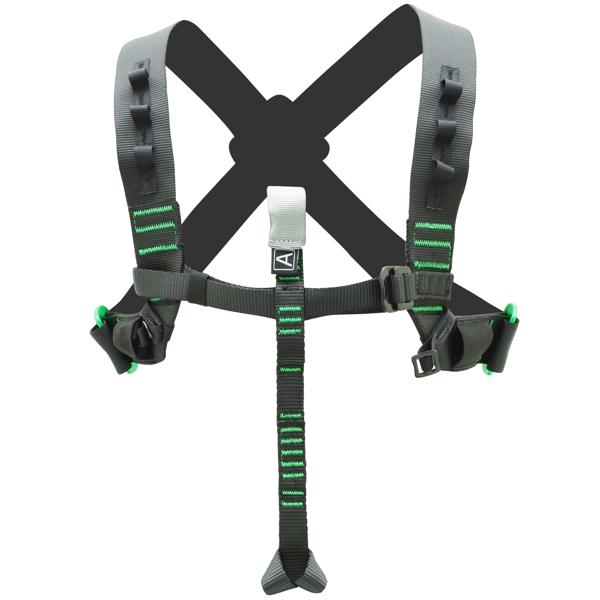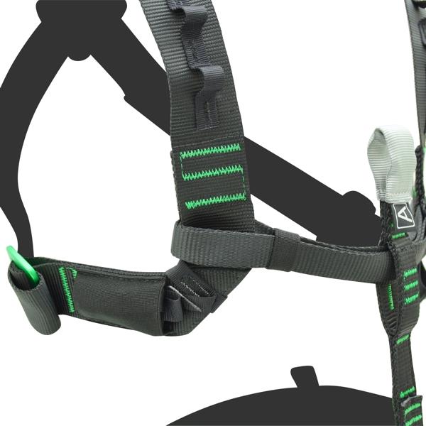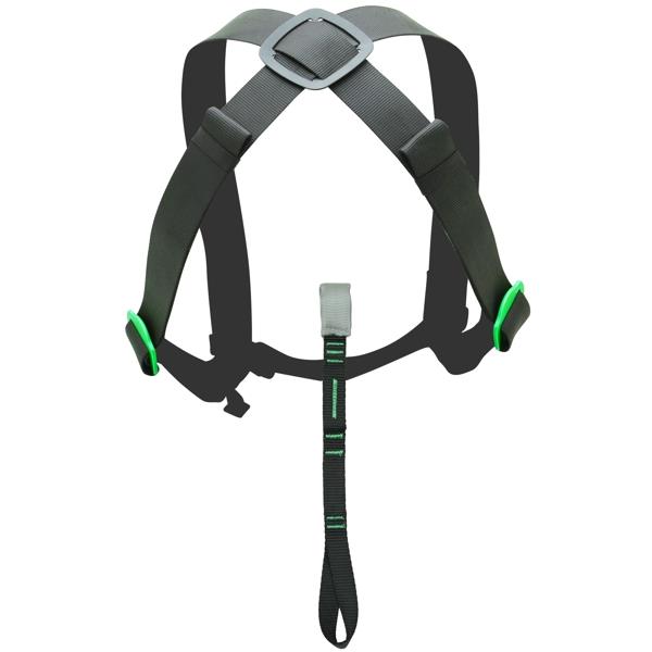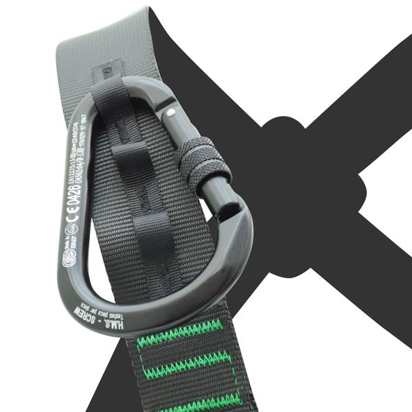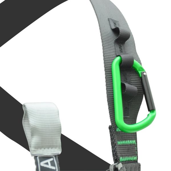 Il collegamento tra imbracatura bassa e pettorale avviene tramite una prolunga raccordabile a bocca di lupo.